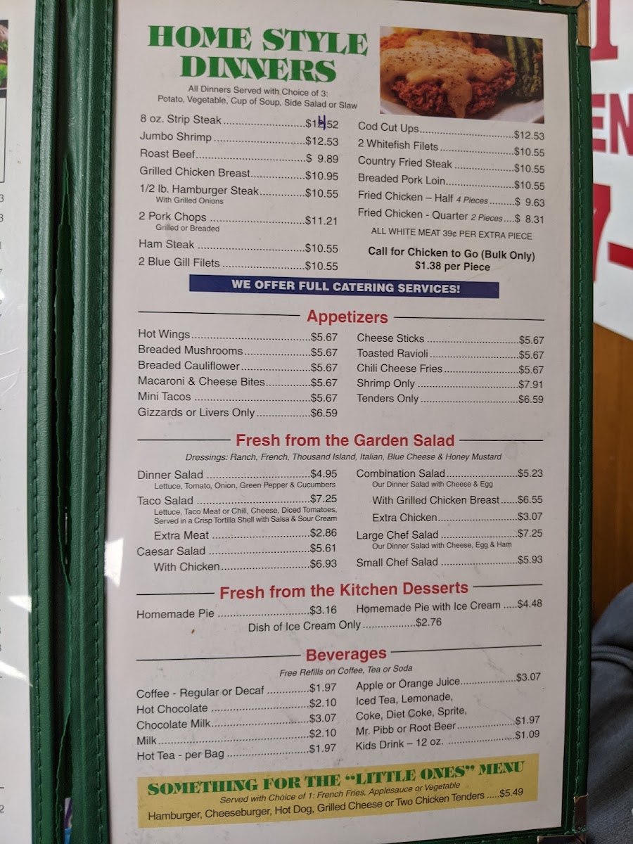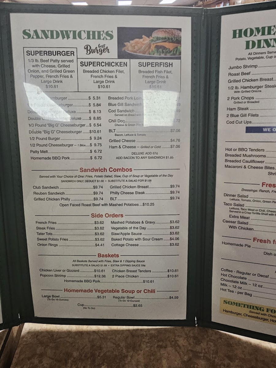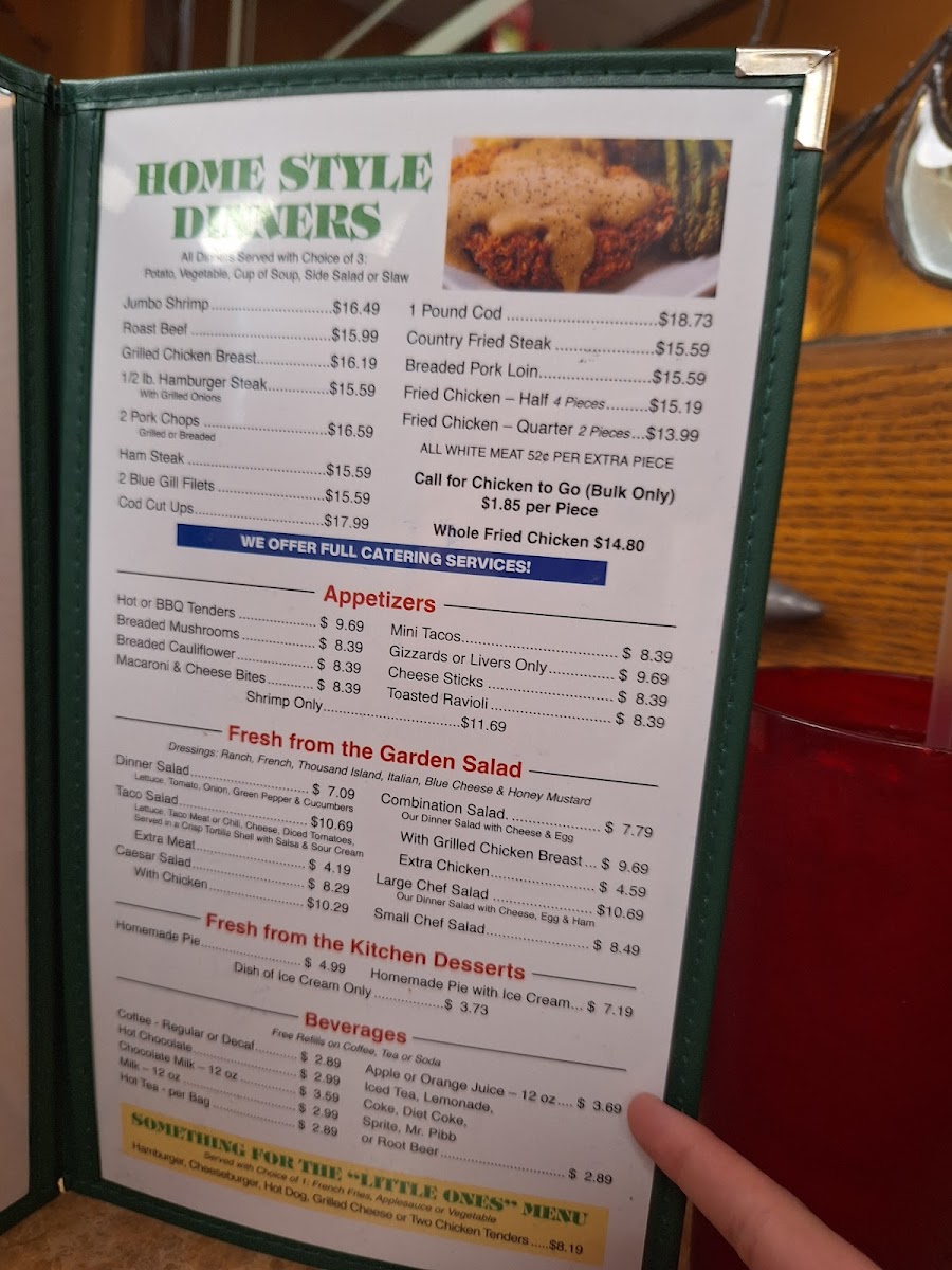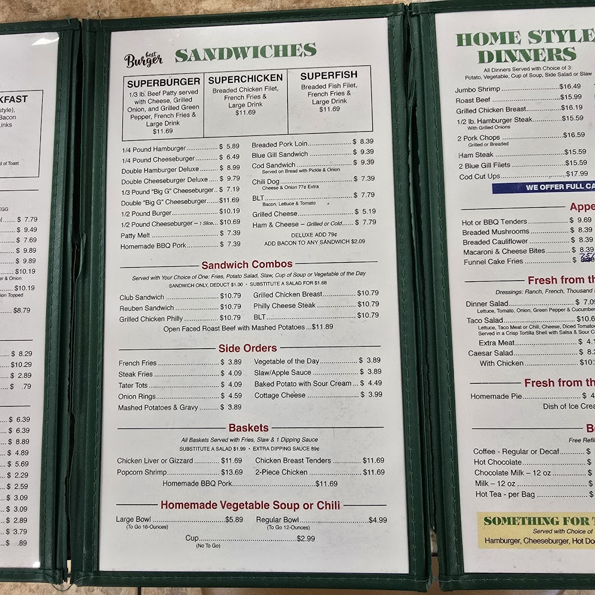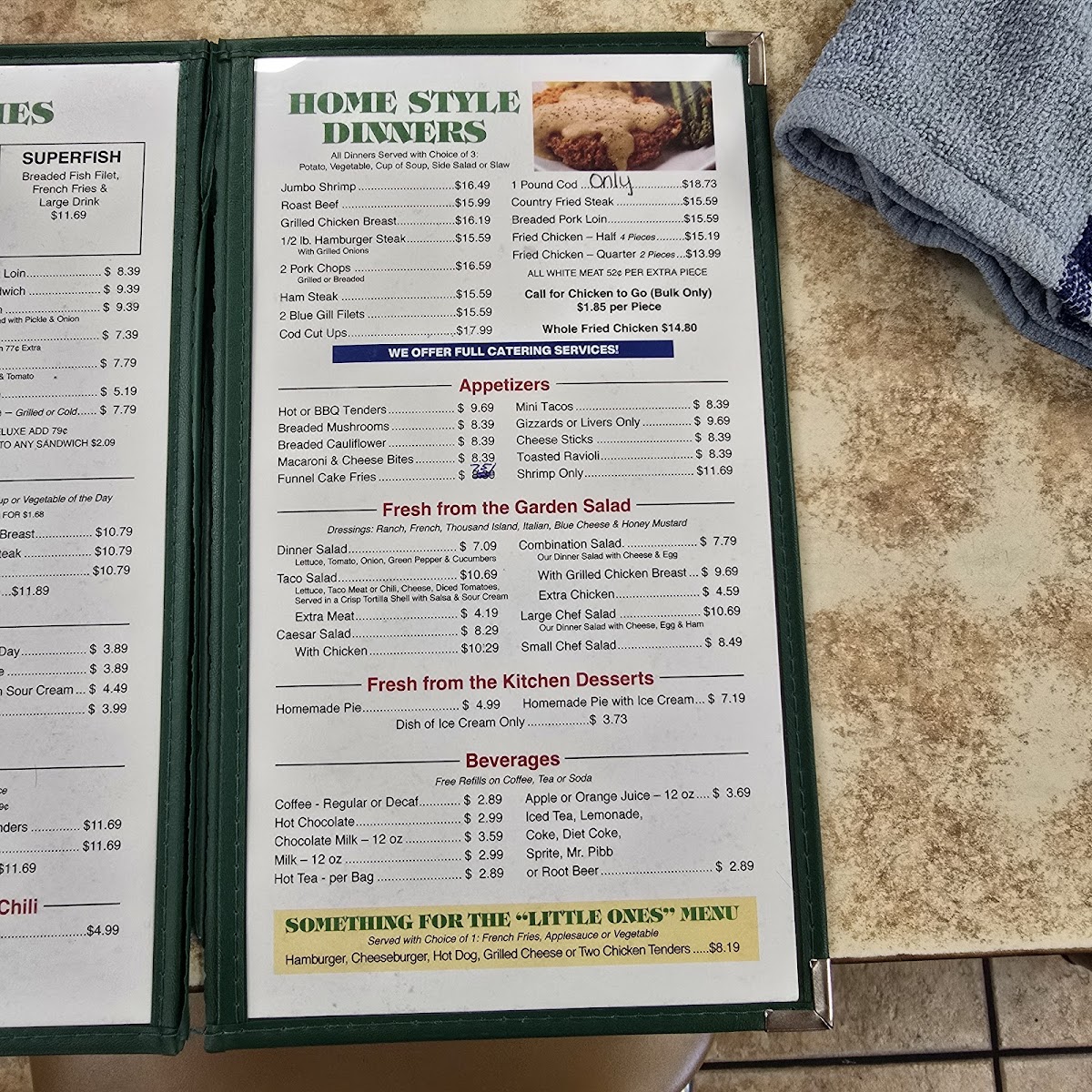The menu features all-time favorites like biscuits and gravy, waffles, and country fried steak, alongside traditional dinners such as fried blue gill with German potato salad and cod with creamy slaw. Guests will also find casual sandwich combos and options suited for lighter appetites or children, making it a versatile choice for families and regulars alike.
